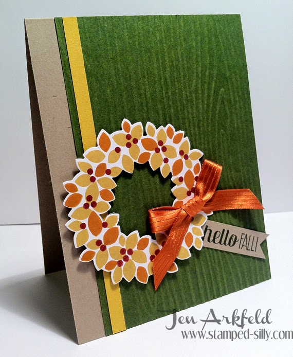 I stamped the background of the Crumb Cake card base with the leaves and acorns from For All Things.